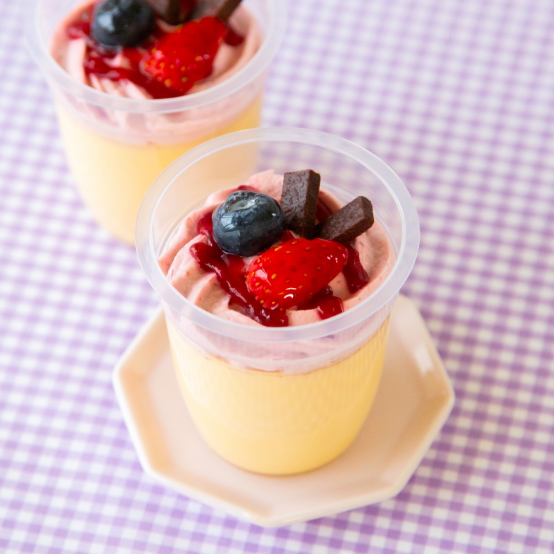 和三盆糖を加えた上品な甘さのプリンに純生クリーム使用のフランボワーズクリームを絞り、種入りラズベリージャムとザクザク食感のチョコレート、甘酸っぱい苺、ブルーベリーをのせました。