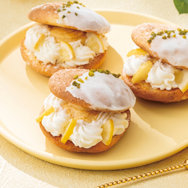 ふんわりとした生地で純生クリームを使用した爽やかなレモンクリームと瀬戸内産レモンピール入りのレモンカスタードをサンドしました。アクセントにピスタチオをトッピングした季節限定のナボナです。